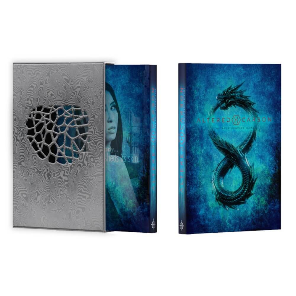 This limited edition Deluxe version of the Official Altered Carbon Roleplaying Game includes the same interior content as the core book, but with new dramatic cover art and an intricately designed die-cut slip case.