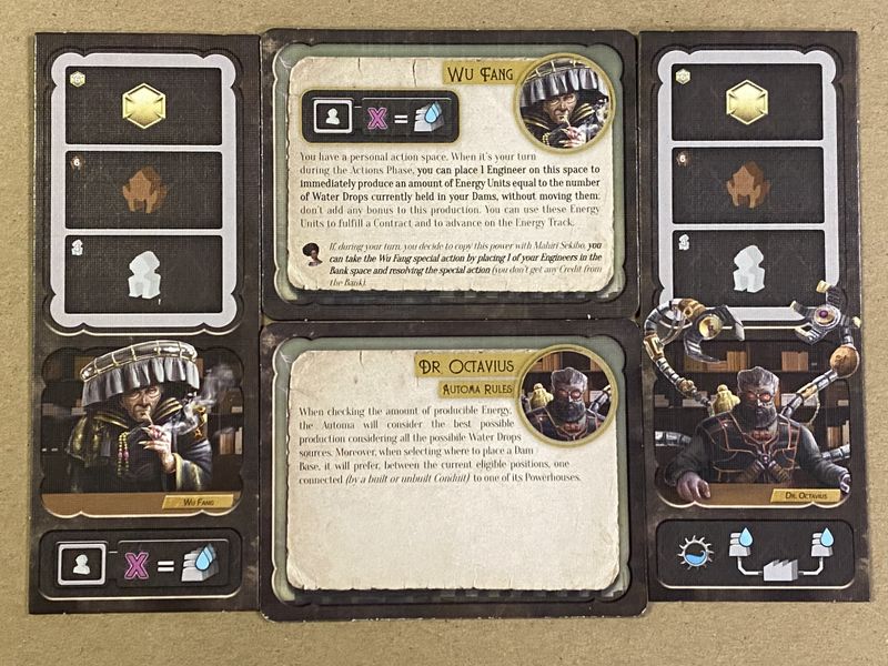2 new Executive Officers distributed exclusively to Kickstarter backers, as part of the 5th player Expansion campaign. Later available in pack E of the Dice Tower 2022 Kickstarter campaign. Wu Fang: You have a personal action space. When it is your turn, during the Action Phase, you can place 1 Engineer on this space to produce an amount of energy equal to the number of Water Drops currently held in your Dams. You can't add any bonus to this production, but you can use it to fulfill a Contract. The Water Drops stay where they are after this action. Dr. Octavius: When producing energy by activating one of your Powerhouses with a Production action, you can use any Water Drops from one or more of your Dams or Neutral Dams connected to the activated Powerhouse. When using the German company ability, you can use this ability only with your first production.