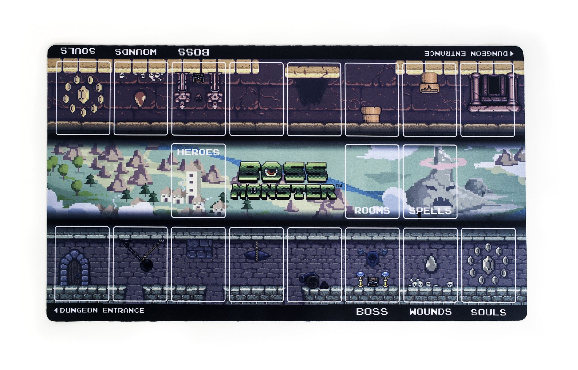The official Boss Monster playmat has finally arrived! Whether you’re a die-hard fan looking for a premium tabletop experience or you’re a brand-new player hoping to learn, this gorgeous full-color playmat is the ultimate Boss Monster accessory. This mousepad-style rubberized foam playmat is inspired by the overworlds and dungeons of classic video games. The different zones of play are all clearly labeled, making this playmat the easiest way to teach new players the game. It’s optimized for two-player games — but it also looks great on the table with a third and fourth player flanking the edges. It comes packed in a reusable 15 inch plastic box, allowing you to roll up your playmat and take it on the go.