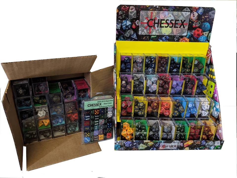 Box of 50 Speckled Polyhedral Dice Sets Each box contains: 1 Air 3 Arctic Camo 1 Barracuda 4 Cobalt 2 Earth 3 Fire 1 Golden Cobalt 1 Golden Strawberry 1 Golden Water 1 Granite 4 Hurricane 2 Lathyrus 2 Lotus 1 Mercury 4 Ninja 1 Primula 3 Recon 1 Sea 2 Space 3 Stealth 2 Strawberry 2 Urban Camo 1 Veronica 4 Water
