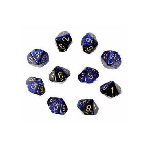 A set of Gemini Polyhedral ten d10s from Chessex, with Black-Blue background and Gold numbers