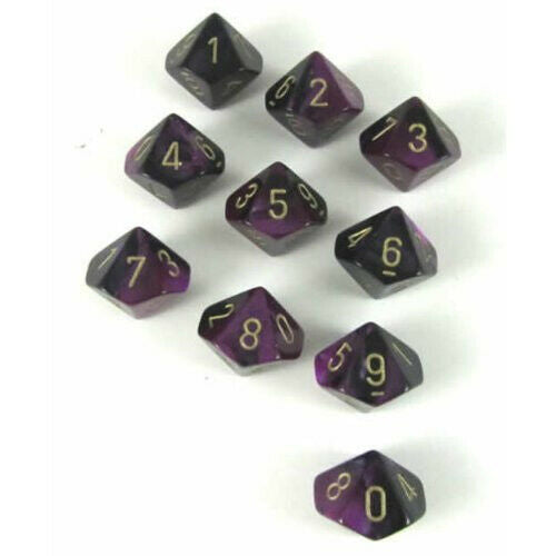 A set of Gemini Polyhedral ten d10s from Chessex, with Black-Purple background and Gold numbers