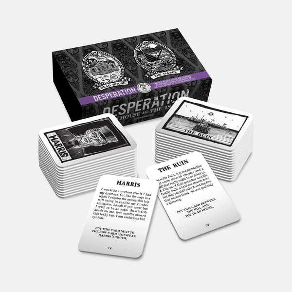 Desperation asks you to assume an unusual point of view—instead of deciding what people say and do, you decide who says and does the things that must happen. The sense of dread is palpable with each card reveal, because in these games, the things that must happen are a gradually escalating kaleidoscope of unimaginable horror.