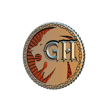 38mm metal coin with colored enamel highlights, featuring symbology and coloring from Gloomhaven.