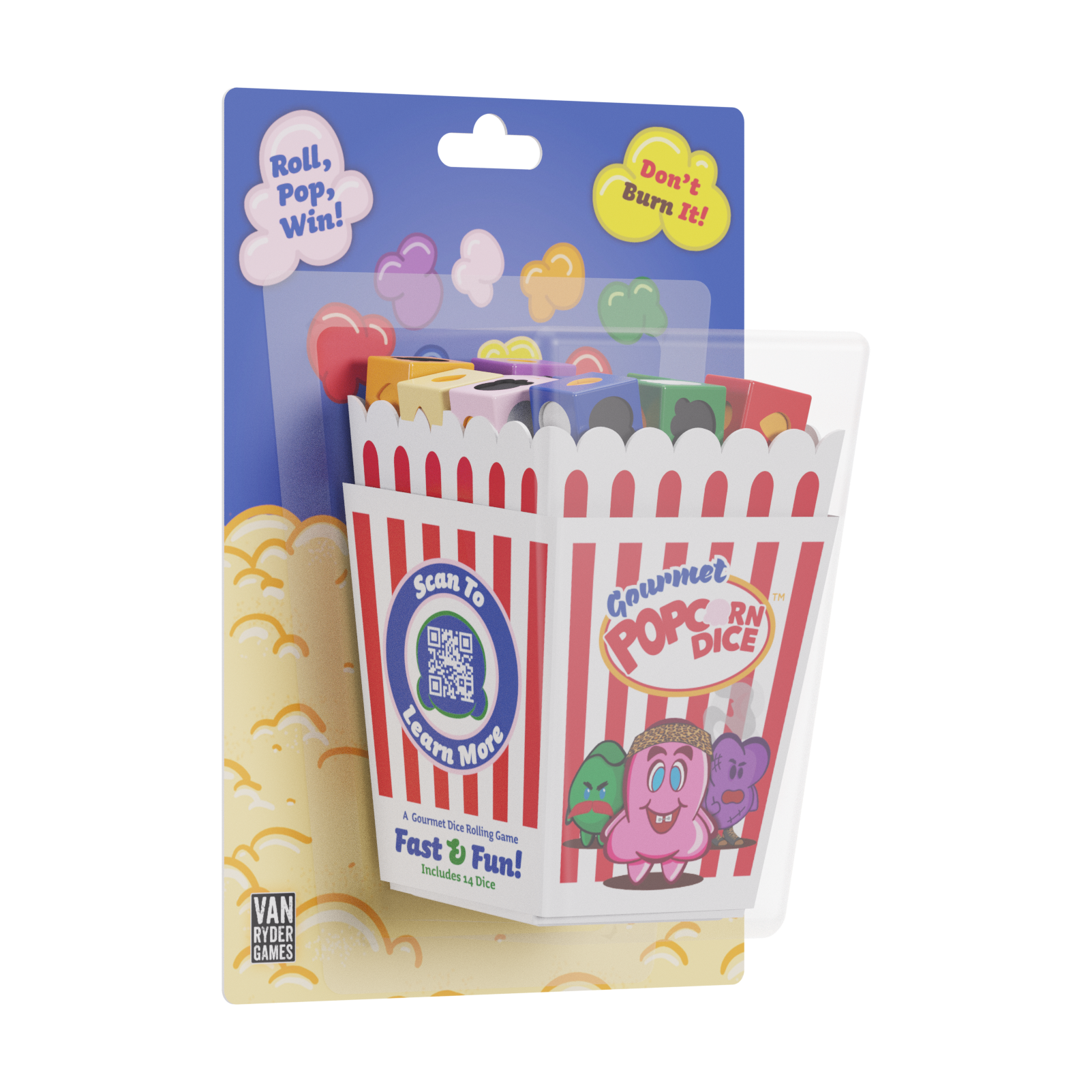 Gourmet Popcorn Dice is a fast & fun dice game for the whole family! Roll your dice to pop your popcorn, but careful not to let it burn. Each popcorn rolled is one point and double pops are worth two, kernels go back to be rolled again. Get bonus points for matching gourmet color pairs. If you roll 4 burnt popcorns you bust and don't score any points for the round, but you can mitigate them by using a double pop to cancel a burnt pop. After each roll, decide to stop and score or press your luck and roll again.