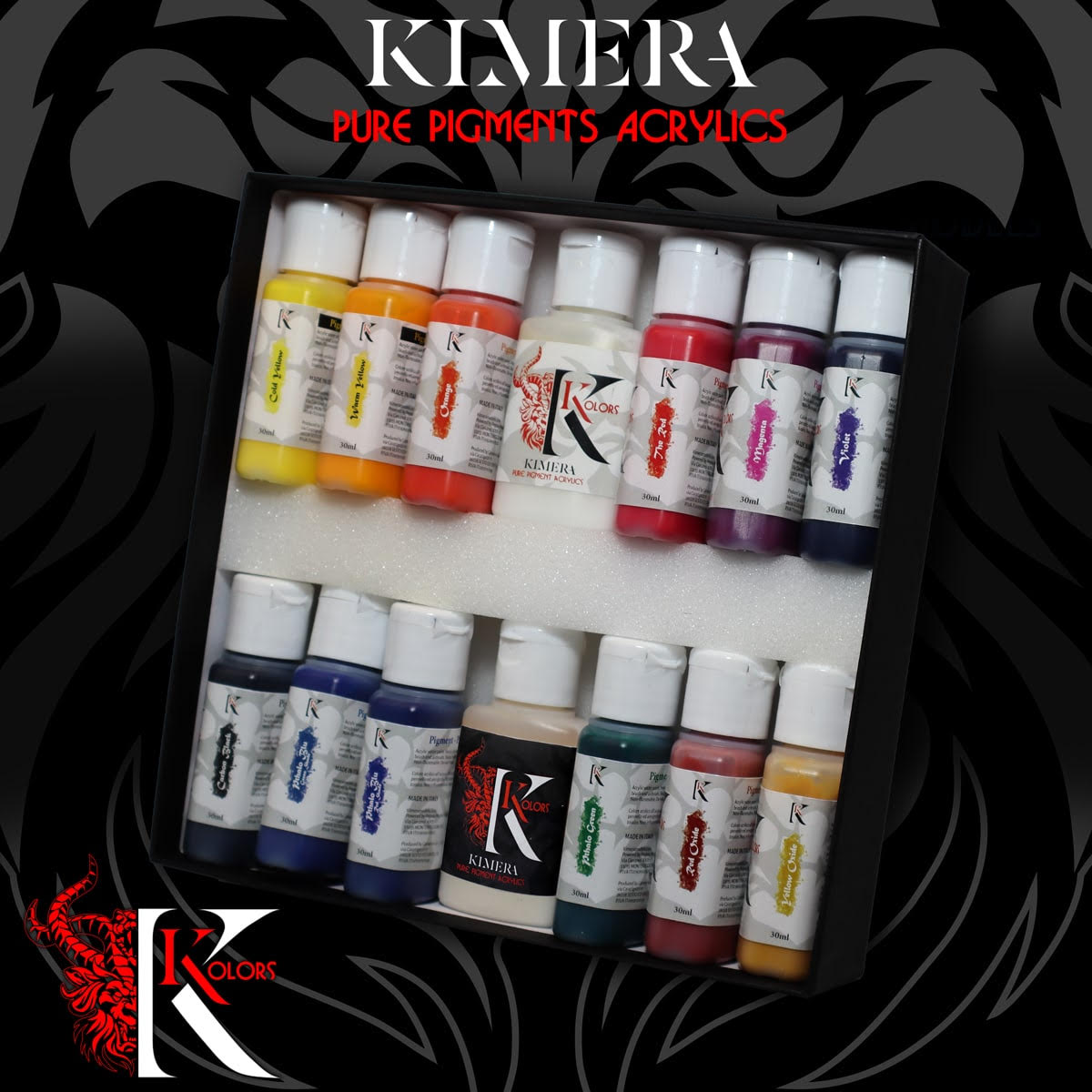 13 pure pigment acrylics and 1 satin medium, 30ml dropper bottle with flip top cap, agitator steel ball inside each pot High pigment concentration, ranging from 30% to 50% Creamy consistence and matt finish, but they can be made satin by adding in the satin medium provided.
