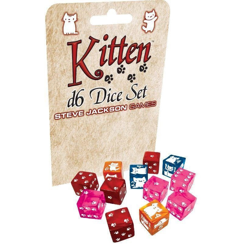 Featuring the adorable artwork of Katie Cook, this set of twelve 16mm six-sided dice brings mischievous kittens to your favorite game! They’ll appeal to gamer people and kitty people and everyone in between! Everyone needs more dice. Just be careful when you take these cute kitty and paw print dice to your next gaming session; the other cat fanatics at the table may try to knock the dice to the floor and keep them for their own dice collection.