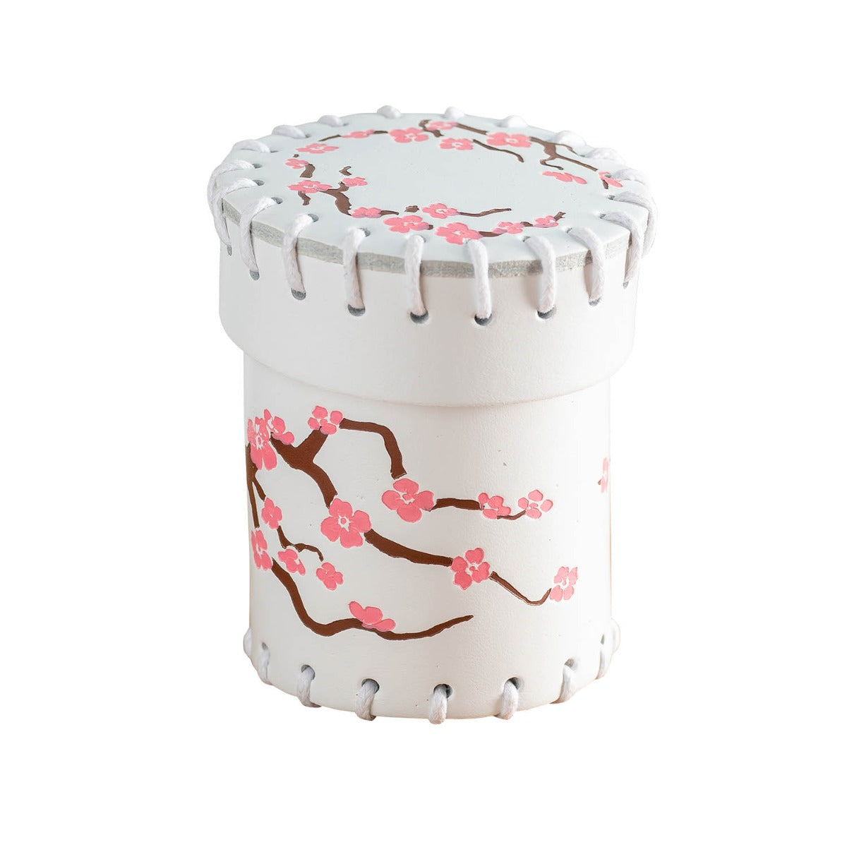 That experience has inspired us to create this Japanese Leather Dice Cup. We made it of natural leather in white color and adorned its lid and body with a colorful print; it shows a brown cherry tree branch as it's beginning to that is starting to come to life with pink flowers!