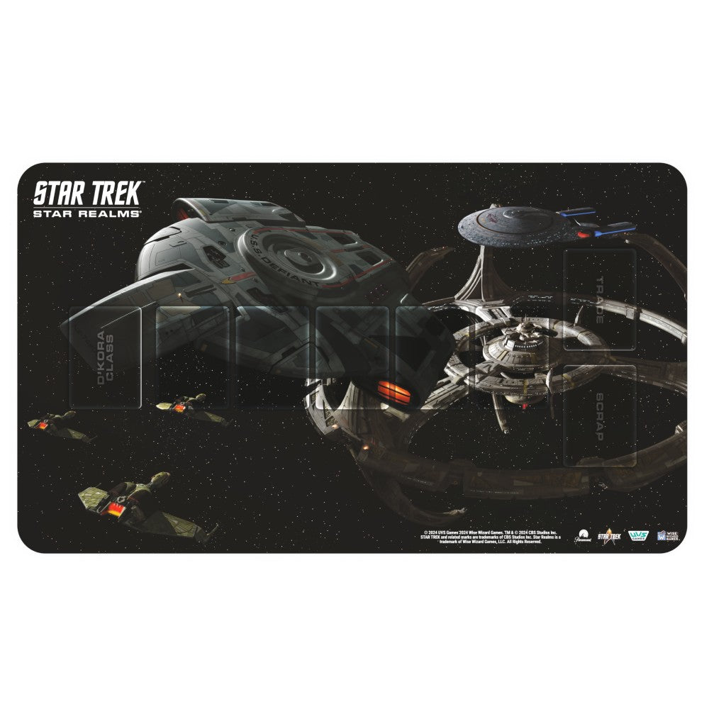 The STAR TREK: Star Realms U.S.S. Defiant Playmat is designed to enhance your gameplay experience, featuring designated spots for the Trade Row, as well as the Scrap and Trade piles, on a neoprene playmat with a rubber backing.