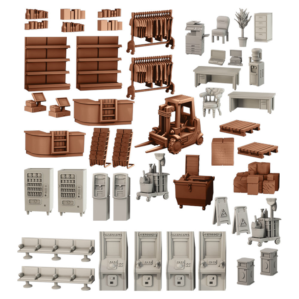 From deserted post-apocalyptic ruins to contemporary criminal skirmishes in, this set you’ll find the furnishings for offices, warehouses, shops, and malls. A huge variety of pieces to fill any built-up area!