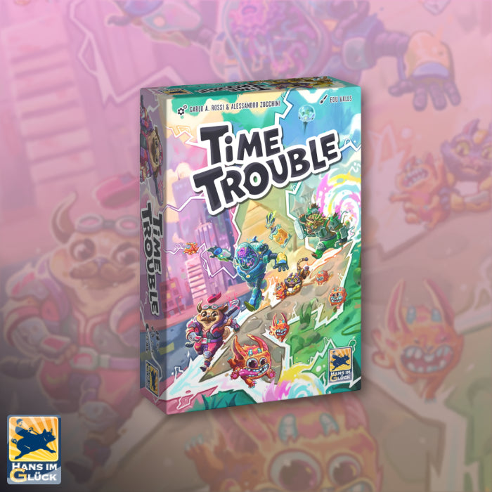 In the cooperative family game, Time Trouble, you navigate 4 characters through different levels by layering transparent cards. Your goal is to catch the fluffies, which are messing with the timeline. With each level, you travel through time to address new challenges. Together, you need to coordinate your actions and use the characters' abilities to succeed – but you only have 40 seconds to carry out your plans!
