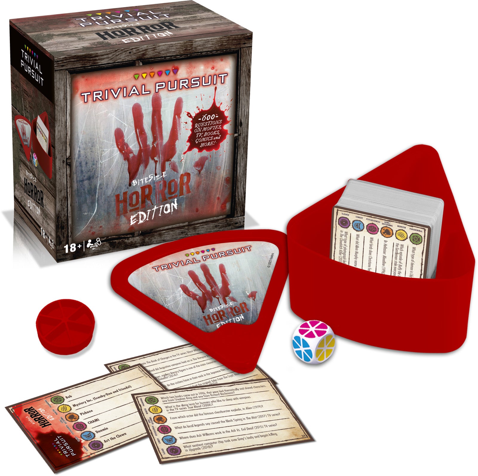 Brand new edition of Trivial Pursuit featuring your favourite Horror moments! This quick-play quiz has 600 questions that will entertain and educate even the smartest fanatics Fascinating, puzzling and captivating questions that will test your horror knowledge and memory Bitesize game comes with coloured dice, 100 cards and easy-to-carry wedge case A challenging game thats fun for all the family! With 600 questions from the world of movies, TV, books and comics, this Trivial Pursuit game is a great gift for any friends who seek the spooky, marvel at the macabre and delight in the disturbing.