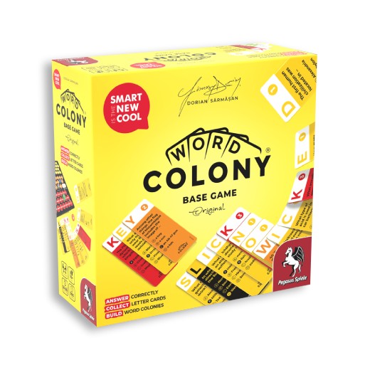 Word Colony combines trivia, word, and strategy games into a fresh and fun mix that is challenging and enjoyable. At its core, Word Colony has players accumulating individual letter cards in order to spell words. Most cards display a letter, a question, and a points value. Some cards are special and trigger abilities such as: Immunity, Magic Word, Fist Bump, and Conquest.